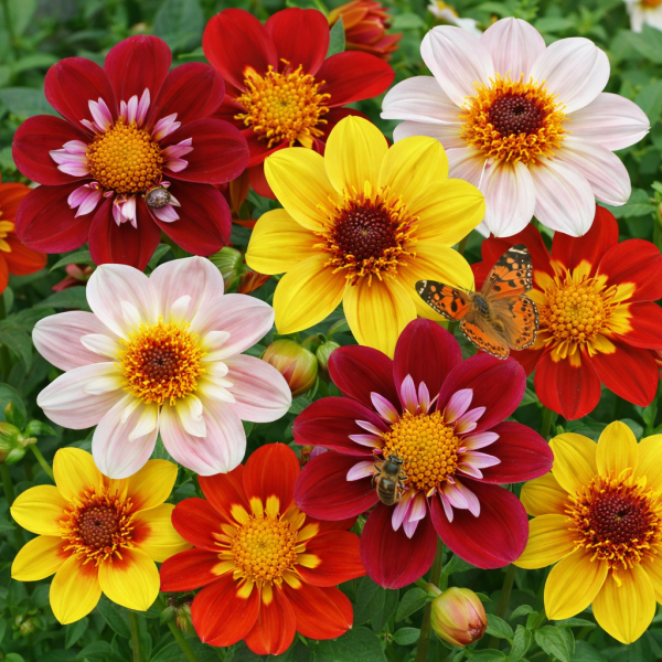Krāsains vienrindas dāliju maisījums, kas radīts, lai piesaistītu bites un tauriņus. Ziedi ir atvērti ar spilgtu centru, kas tos padara īpaši pievilcīgus apputeksnētājiem. Maisījums sastāv no sarkanām, dzeltenām, baltām un oranžām puķēm, kas perfekti iekļaujas dabiskā stilā veidotos puķu dobēs.
