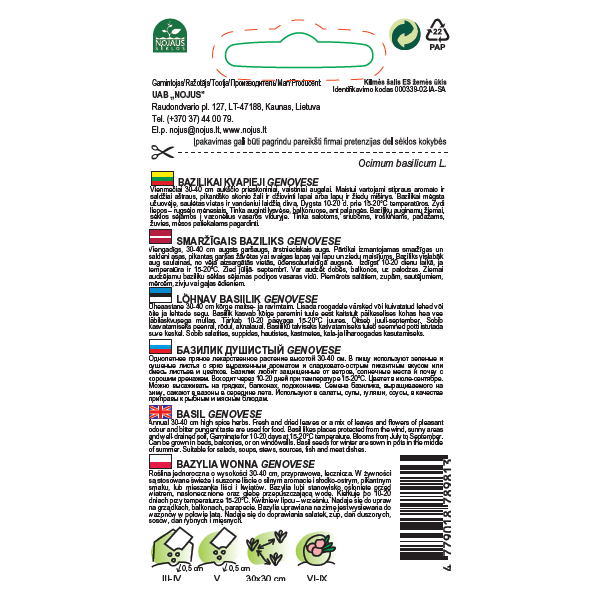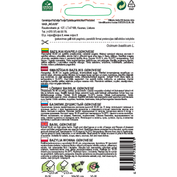 Smaržīgais baziliks "Genovese" Viengadīgs, garšaugu un ārstniecības augs. Ļoti populāra un augstvērtīga baziliku šķirne. Sezonas laikā, apgriežot, var ataugt pat 7–8 reizes. Baziliks izaug līdz 45–60 cm augstumam. Ļoti piemērots tradicionālās itāļu Pesto mērces pagatavošanai. Var audzēt balkonā vai uz palodzes. Tēja no tā lapām veicina apetīti un uzlabo gremošanu. Bazilikiem patīk aizsargātas, saulainas vietas un labi drenēta augsne. Sēklas dīgst 10–20 dienās +15–20 °C temperatūrā. Baziliks zied no jūlija līdz septembrim. |