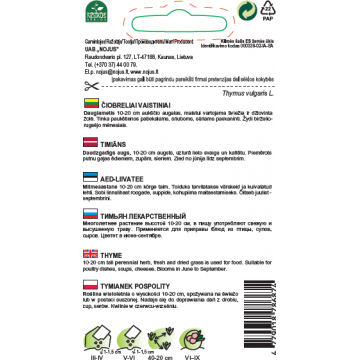 Ārstnieciskā timiāna Daudzgadīgs ārstniecības, garšaugu, medusaugu un dekoratīvs augs. Timiāns ir piemērots gaļas ēdieniem, zupām un sieriem garšas papildināšanai. Timiānam piemīt klepu mazinošas un gremošanu veicinošas īpašības. |