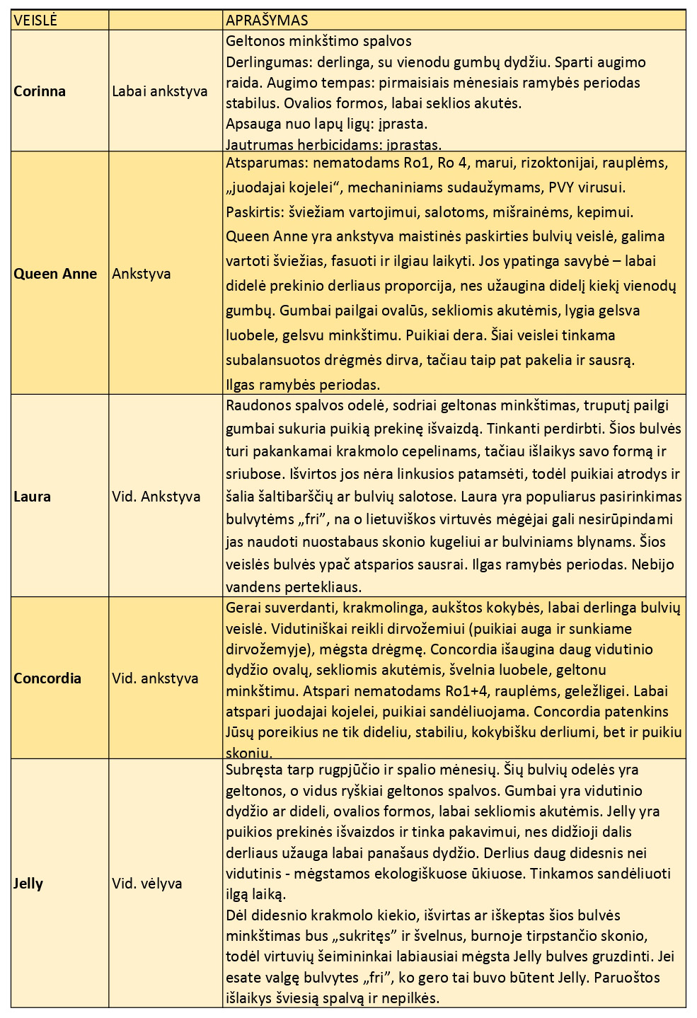 LAURA – sarkano kartupeļu karaliene. Vidēji agrīna, pārtikas kartupeļu šķirne, piemērota pārstrādei. Sarkanā miziņa, piesātināti dzeltens mīkstums un nedaudz iegareni bumbuļi nodrošina lielisku tirgus izskatu. Šiem kartupeļiem ir pietiekams cietes daudzums cepelīniem, taču tie saglabā formu arī zupās. Pēc vārīšanas tie nemēdz aptumšoties, tāpēc labi izskatās gan pie aukstās zupas, gan kartupeļu salātos. “Laura” ir populāra izvēle frī kartupeļiem, bet lietuviešu virtuves cienītāji tos droši var izmantot arī gardam kugelim vai kartupeļu pankūkām. Šī šķirne ir īpaši izturīga pret sausumu. Ilgs miera periods. Nebaidās no lieka mitruma.