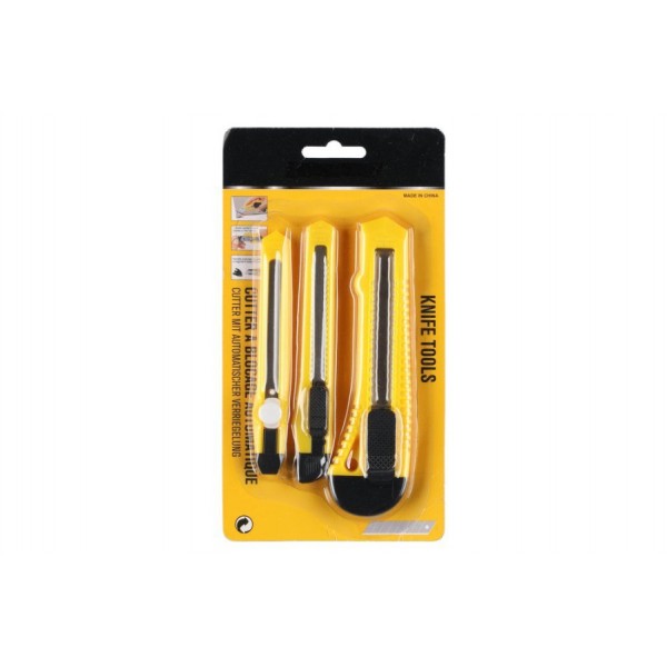 Trijų segmentinių peilių rinkinys, skirtas įvairiems pjovimo darbams namuose ar dirbtuvėse.